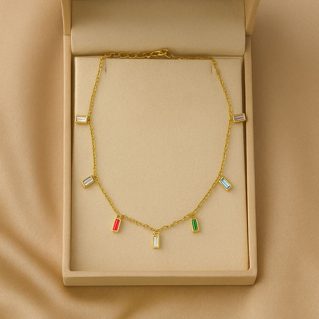 Crafted in a radiant gold-plated finish, this necklace features sleek rectangular baguette-cut stones in a stunning array of colors — creating a perfect balance of elegance and vibrance.
