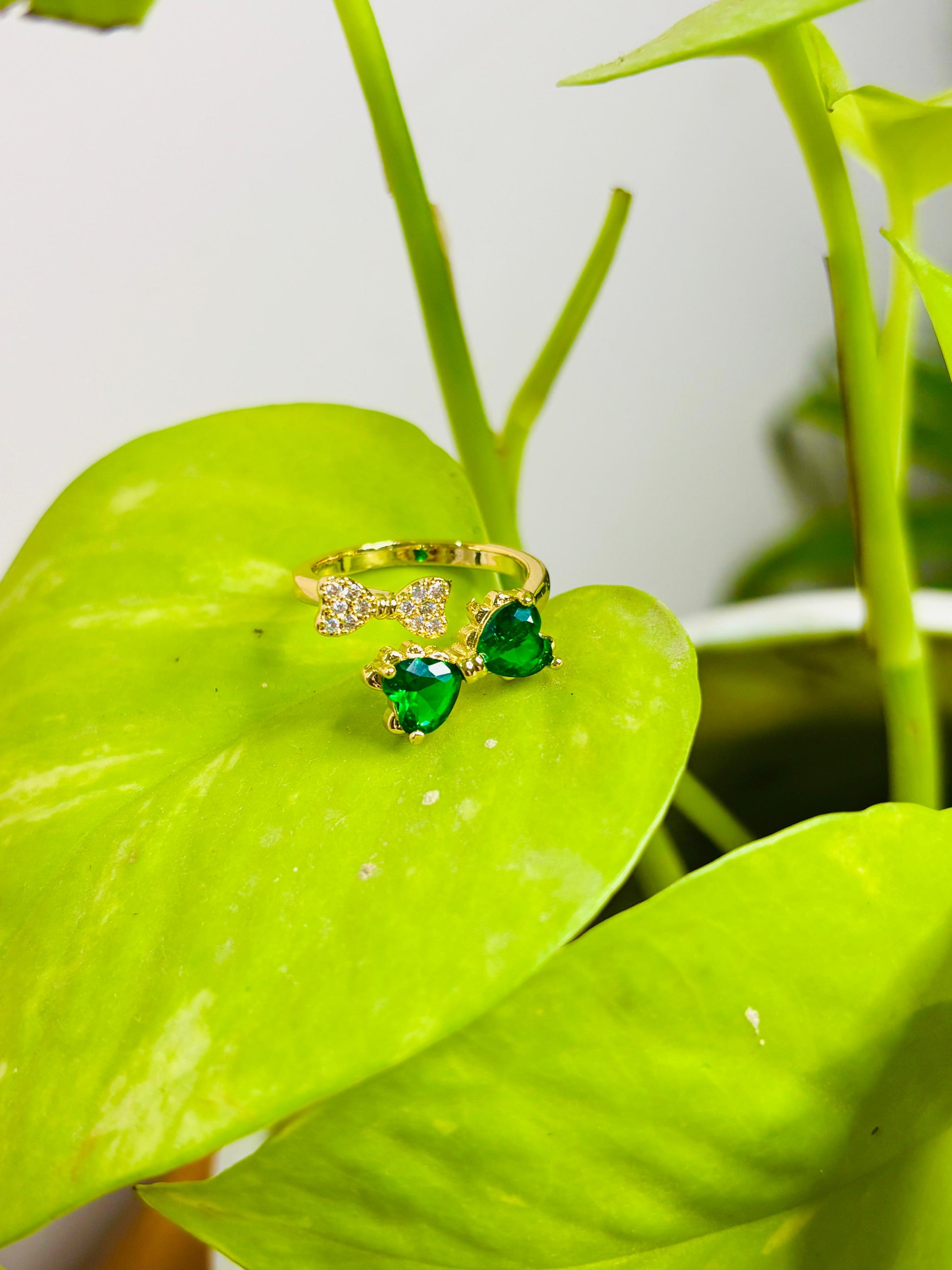 Elevate your style with the Emerald Bow Statement Ring, crafted from polished gold and adorned with sparkling gemstones. The delicate double-bow design features rich green heart-shaped stones paired with shimmering white crystals, creating a perfect balance of elegance and charm. Ideal for adding a luxurious touch to any outfit, this ring transitions effortlessly from daytime sophistication to evening glamour.
