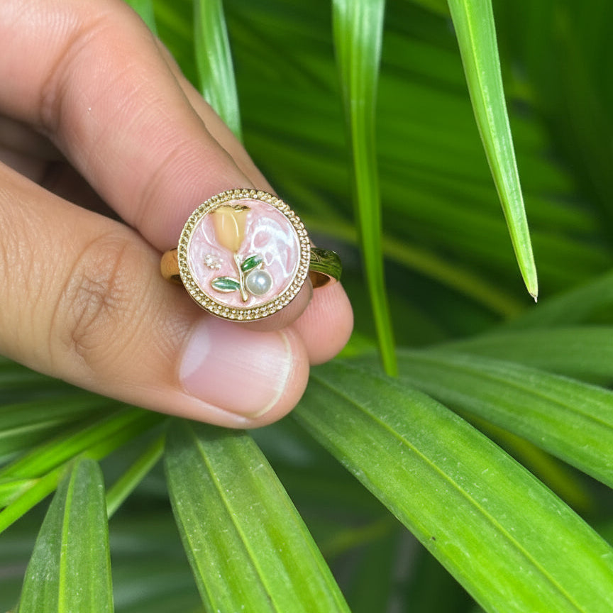 Delicate and romantic, this gold floral ring embodies timeless femininity. The round face features a soft pink enamel background adorned with a charming yellow rose design, accented by a small crystal and a luminous pearl detail. A textured gold border adds sophistication, making this piece both whimsical and elegant. Perfect for adding a gentle touch of color and grace to your everyday look or as a thoughtful gift for someone special.