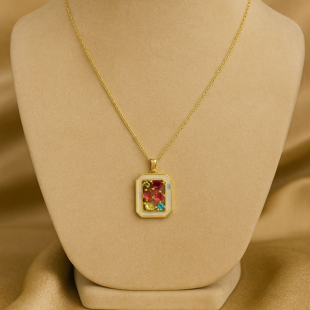 This exquisite pendant features nine radiant gemstones, each representing prosperity, strength, and balance. Set in a sleek rectangular gold frame, the design blends tradition with modern sophistication — perfect for both everyday wear and special occasions.