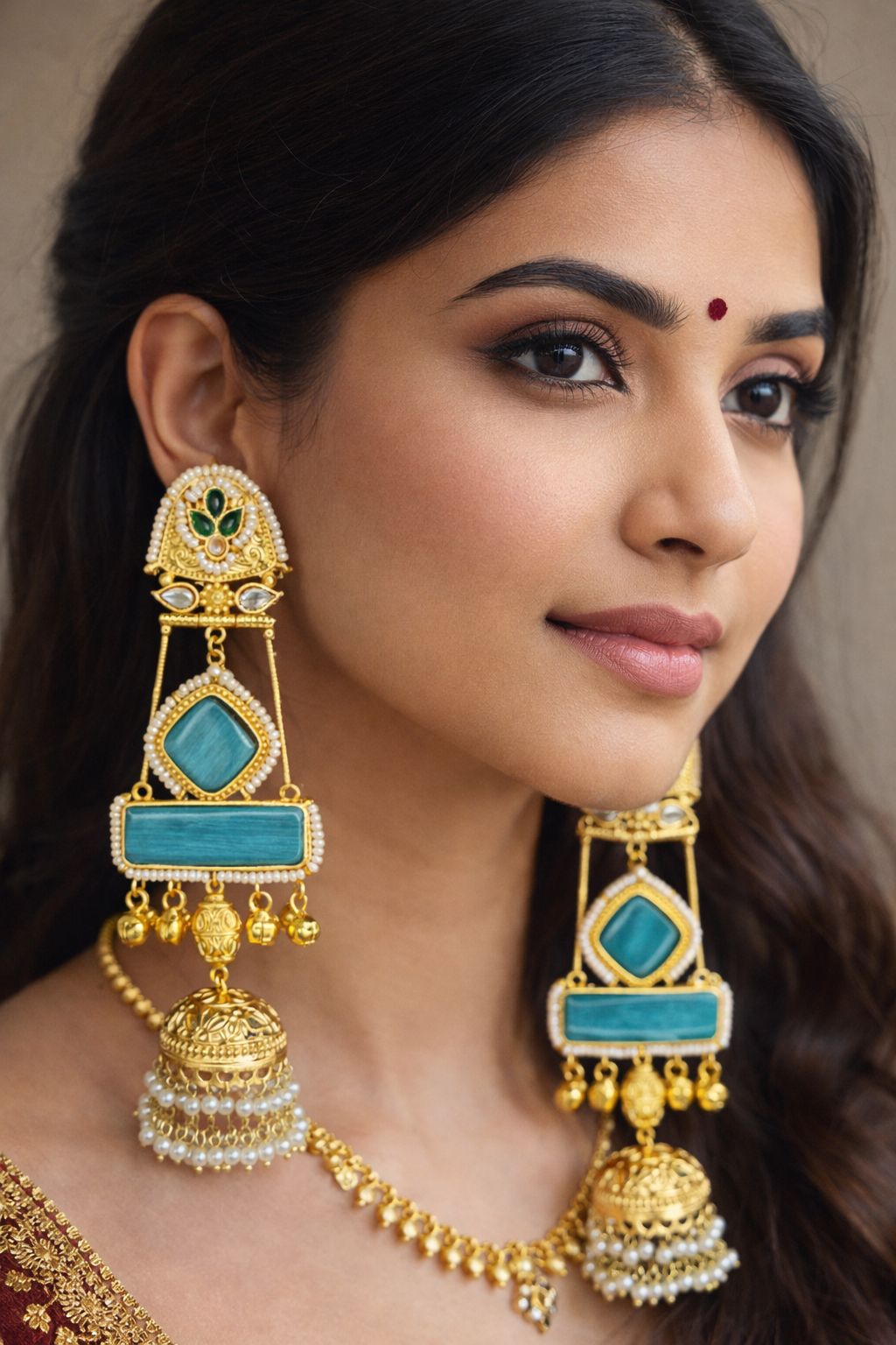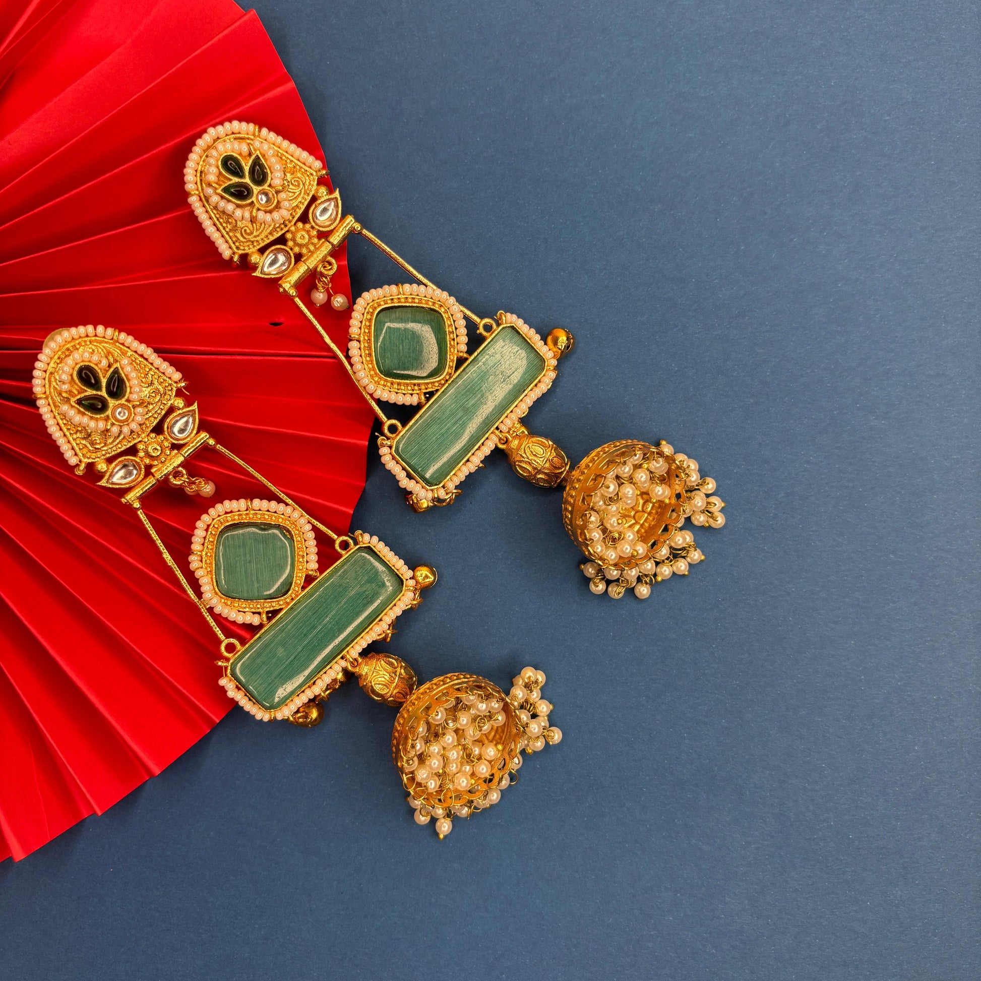 Elevate your ethnic look with these stunning long jhumka earrings crafted in an antique gold finish. Featuring soothing emerald green stones framed with delicate pearl detailing, this design is inspired by traditional Indian motifs and temple jewelry aesthetics. The layered geometric structure is beautifully complemented by ghungroo accents and pearl-studded jhumkas that create graceful movement. Perfect for weddings, festive occasions, and cultural celebrations, these statement earrings pair effortlessly with sarees, lehengas, and anarkalis.