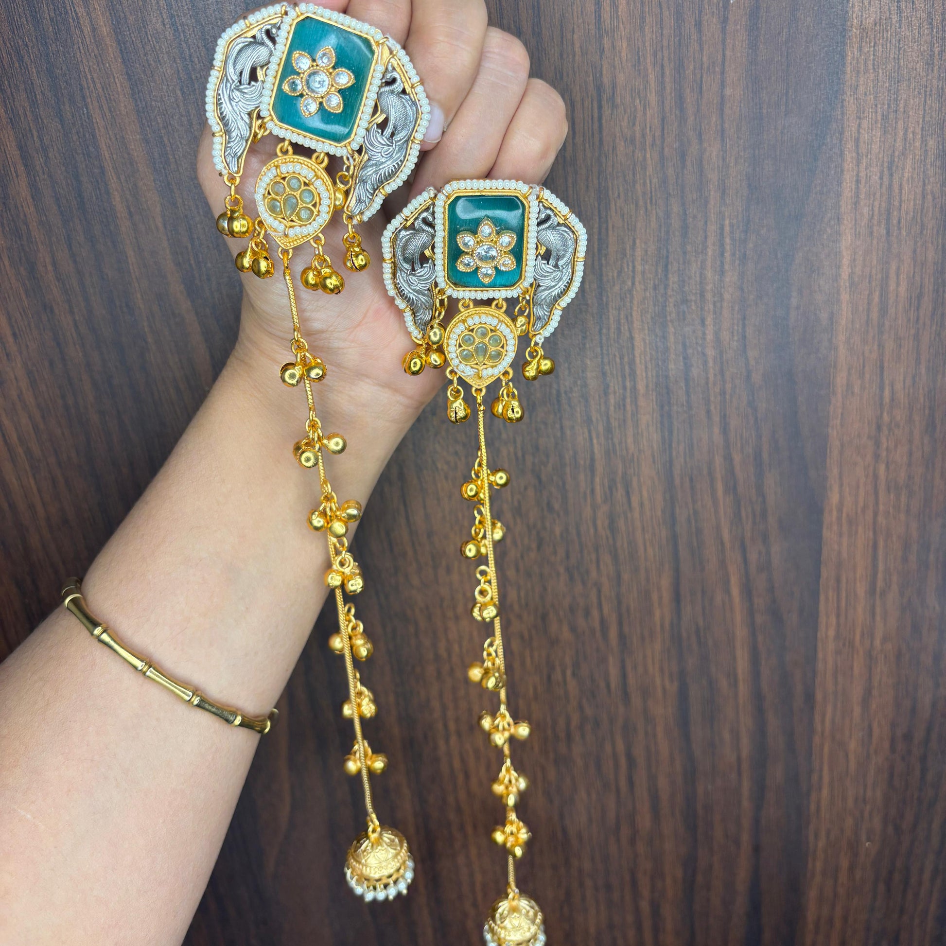 Elevate your ethnic look with these stunning traditional long jhumka earrings inspired by royal Indian artistry. Featuring rich green stones, intricate peacock motifs, and delicate pearl detailing, this pair is beautifully finished with cascading chains and ghungroo jhumkas at the base. The antique gold finish adds a regal charm, making these earrings perfect for weddings, festive celebrations, and special occasions. Designed to make a statement, they add elegance, grace, and timeless beauty to any traditional ensemble.