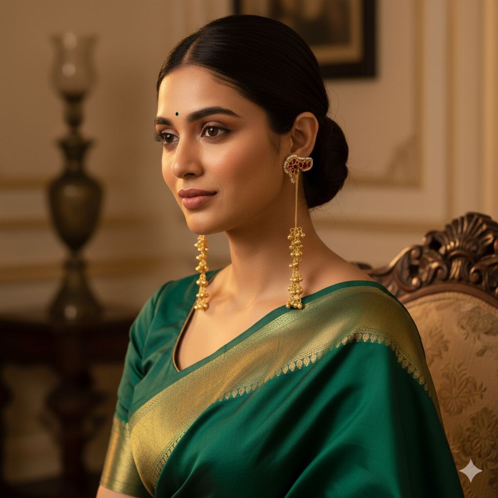 Elevate your traditional look with these exquisitely crafted long chain earrings, inspired by classic Indian artistry. Adorned with vibrant ruby stones, delicate pearl detailing, and cascading ghungroo clusters, this pair creates a graceful, rhythmic movement with every step. The intricate gold-finish base adds a regal touch, making these earrings perfect for weddings, festive celebrations, and ethnic ensembles. Lightweight yet striking, they beautifully balance elegance and tradition for a timeless statement.